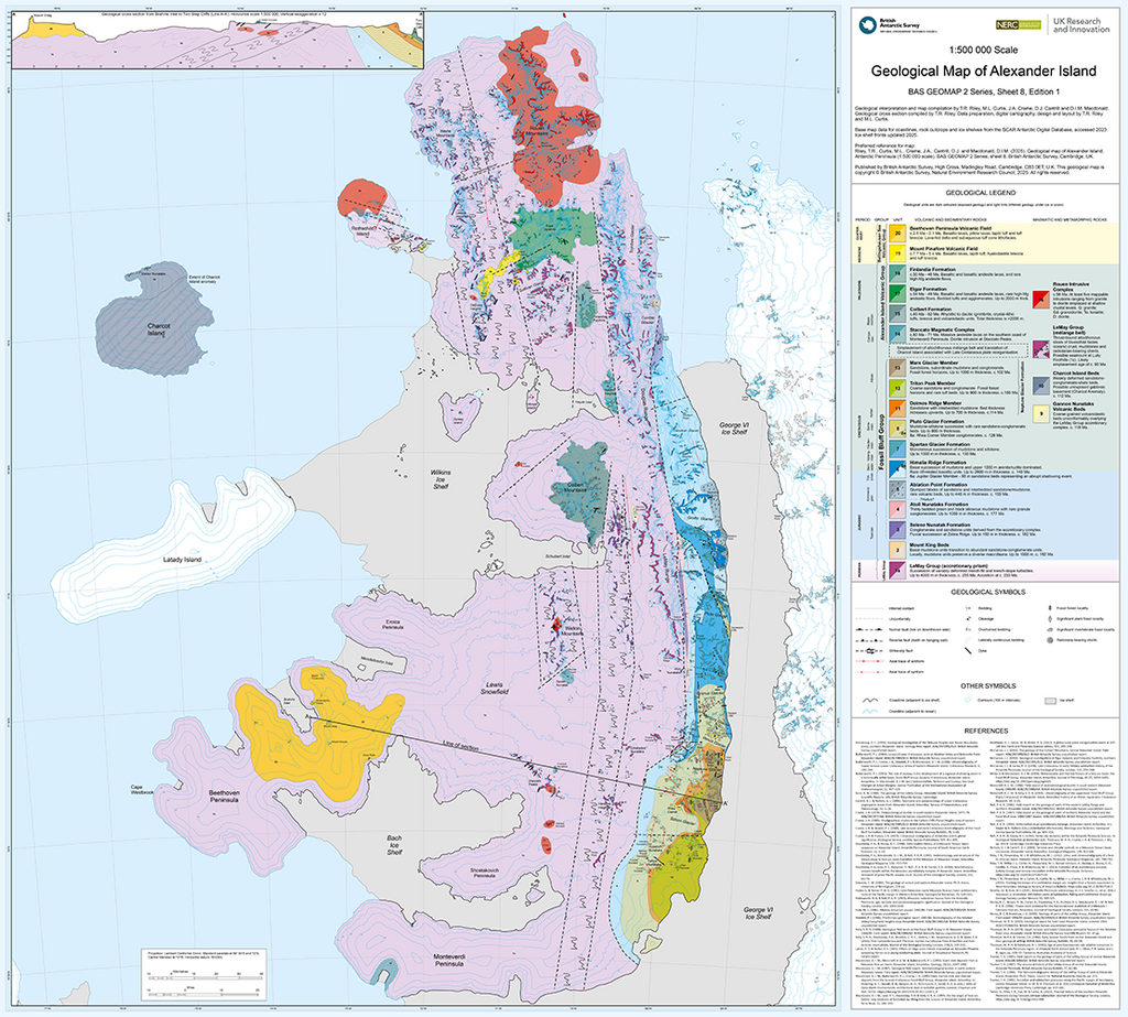 This double-sided map provides a topographic map on one side and a geological map on the other, both covering the same extent of Alexander Island and the surrounding islands. The maps cover Alexander, Rothschild, Charcot and Latady islands, as well as Wilkins, Bach and George VI ice shelves. Rymill Coast, on the western coast of the Antarctic Peninsula is also covered.