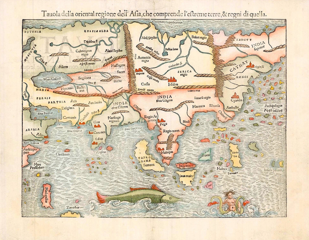 Diese wunderschöne Karte von Asien geht zurück auf den Schweizer Humanisten Sebastian Münster (1488–1552). Das Blatt zählt zu den ersten Kontinentalkarten dieses Erdteils. Es war ursprünglich Teil einer lateinischen Ausgabe der Universalenzyklopädie „Cosmographia“ (1572). Das vorliegende Blatt erschien in einer seltenen italienischen Ausgabe (Cosmografia universale; 1558, 1571, 1575).
