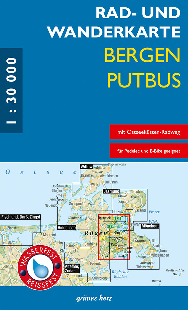 Der Kartenausschnitt reicht von Garz über Bergen und Putbus bis zum Ort Ralswiek und stellt den westlichen Anschluß an die bereits vorliegende Karte "Mönchgut, Granitz" sowie den südlichen Anschluß an die Karte "Halbinsel Jasmund" dieser Serie dar. Die Rad- und Wanderkarte wurde nach geographischen, landschaftlichen und touristischen Aspekten erarbeitet. Der Maßstab von 1:30.000 gibt Raum für eine hohe Genauigkeit und Detailtreue. Neben der exakten Wegezeichnung, unterschieden nach Wanderwegen und Radwanderrouten (die in 3 verschiedenen Kategorien die Oberflächenqualität kennzeichnen), sind Besonderheiten der Landschaft eingetragen.