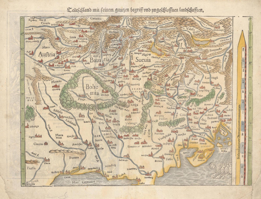 Diese faszinierende Karte von Deutschland geht zurück auf den Basler Universalgelehrten Sebastian Münster (1488–1552). Ursprünglich war das Blatt Teil einer lateinischen Ausgabe der Universalenzyklopädie „Cosmographia“, deren erste Auflage im Jahr 1544 in Basel erschienen war. Das vorliegende Blatt stammt aus dem Jahr 1556.