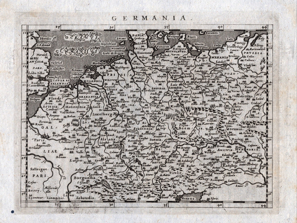 Diese sehr seltene Karte von Deutschland geht zurück auf den italienischen Gelehrten Giovanni Antonio Magini (1555–1617). Ursprünglich war Blatt Teil einer Neuedition des antiken Handbuchs „Geographiae vniuersae tum veteris tum nouae absolutissimum opus duobus voluminibus distinctum“. Das Buch erschien in Venedig (Verlag: Haeredes Simonis Calignani de Karera).