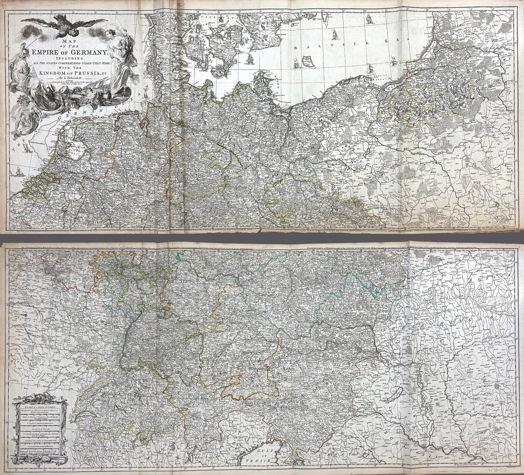 Diese faszinierend genau gezeichnete Wandkarte von Deutschland geht zurück auf den britischen Gelehrten Louis Stanislaw d’Arcy Delarochette (1731–1802). Die erste Ausgabe erschien bereits 1759; die vorliegende Ausgabe ist eine aktualisierte Version von 1794. Ursprünglich war das Blatt Teil des „General Atlas, describing the whole universe“ aus dem Verlag von Robert Sayer. Gestochen wurde das Kartenbild von Thomas Kitchin. Die Wandkarte wurde auf vier Blätter gedruckt - in dieser Ausgabe sind jeweils zwei Blätter zu zwei Bahnen montiert.