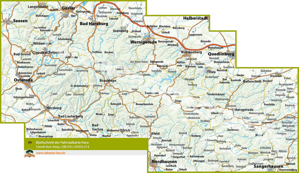 Die Fahrradkarte Harz stellt auf zwei Seiten das gesamte Mittelgebirge im Maßstab 1:50.000 sehr detailliert dar und ist direkt auf die Bedürfnisse der Radfahrer und Mountainbiker zugeschnitten. So werden die Wege danach eingeteilt, ob sie sich für das Touren-Rad (dunkles violett) oder das Mountainbike (grün) eignen, ob es sich um beschilderte Tourenradwege (helles violett) oder um beschilderte MTB-Wege (gestrichelt grün) handelt.