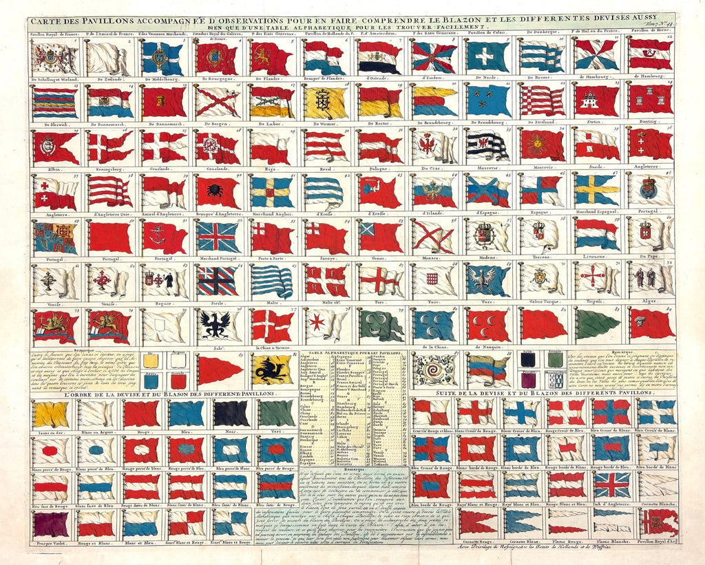 Diese farbenfrohe Darstellung unterschiedlicher Flaggen seefahrender Nationen geht zurück auf den französischen Gelehrten Henri Abraham Châtelain (1684–1743). Ursprünglich war das Blatt des berühmten historischen „Atlas Historique“ (1705–1720; Band 7).