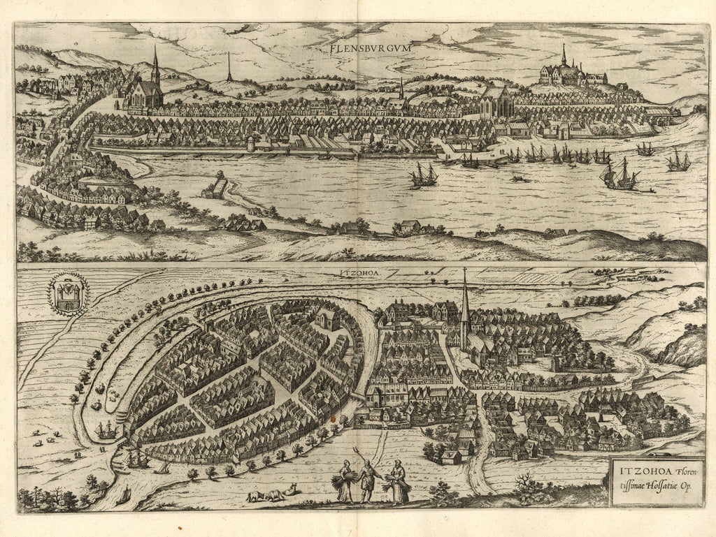 Dieses wunderbare Doppelblatt von Flensburg und Itzehoe stammt aus einem der beliebtesten Bücher der frühen Neuzeit, dem Städteatlas „Civitates Orbis Terrarum“. Veröffentlicht wurde der Atlas vom Kölner Theologen Georg Braun und vom flämischen Kupferstecher Frans Hogenberg. Das vorliegende Blatt stammt aus einer lateinischen Ausgabe.
