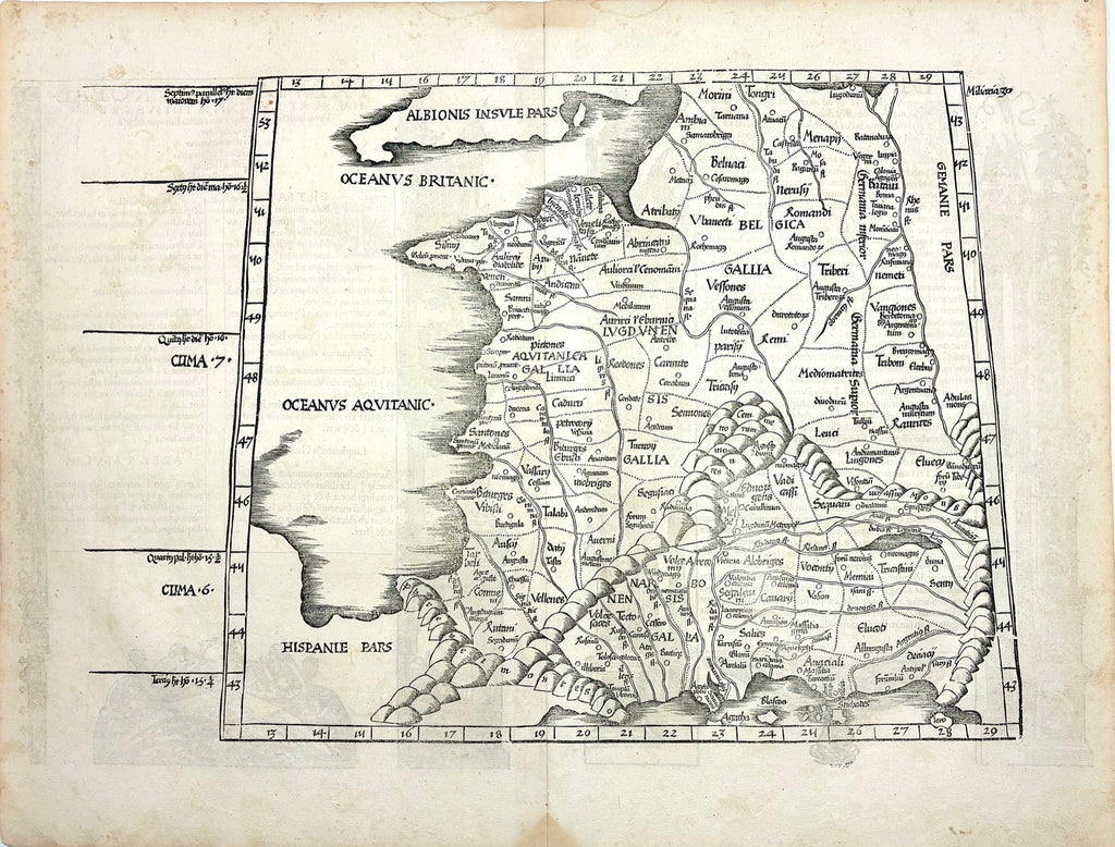 Diese frühe moderne Karte von Frankreich geht zurück auf den einflussreichen Gelehrten Lorenz Fries (ca. 1490–1531). Der ursprüngliche Autor des Kartenbildes war Martin Waldseemüler (1470–1520), der wiederum auf den antiken Geografen Klaudios Ptolemaios (gest. 160) rekurrierte. Das vorliegende Blatt entstammt einer in Lyon gedruckten Ausgabe des Geografie-Handbuchs von Klaudios Ptolemaios („Claudii Ptolemaei, Opus Geographiae“, Melchior & Gaspar Treichel).