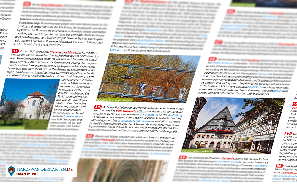Fernwanderwege, wie Harzer Hexen-Stieg, Klosterwanderweg, Grenzweg, Selketal-Stieg und Karstwanderweg sind durch farbige Linien und entsprechende Symbole hervorgehoben. Hinzu kommen noch einige Wander- und Radweg-Empfehlungen.