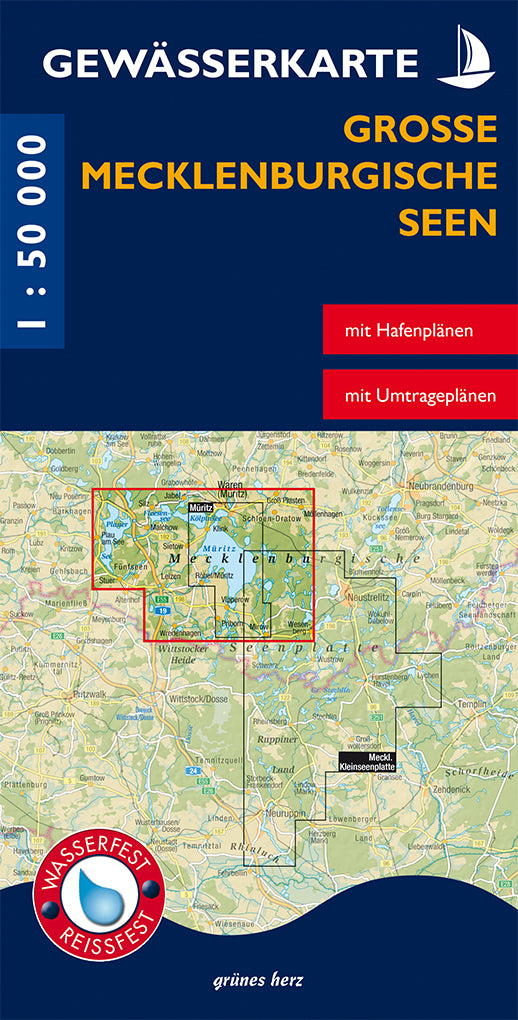 Mittelpunkt dieser speziellen Gewässerkarte ist Deutschlands größter Binnensee – die Müritz und die Seenkette bis hin zum Plauer See. Die Karte (Maßstab 1:50.000) enthält alle wichtigen Informationen für den „Freizeitkapitän“ – wie Wassertiefen, Betonnung, Umtragestellen u. a. maritime Einrichtungen. Auf der Kartenrückseite befinden sich neben der Beschreibung der Region Hinweise für Wassersportler und zu den Schleusen sowie Detailpläne zu den Sportboothäfen und Marinas. Die Karte hat ein Format (68 x 98 cm) und wurde auf reißfestem und wasserfestem Material gedruckt.
