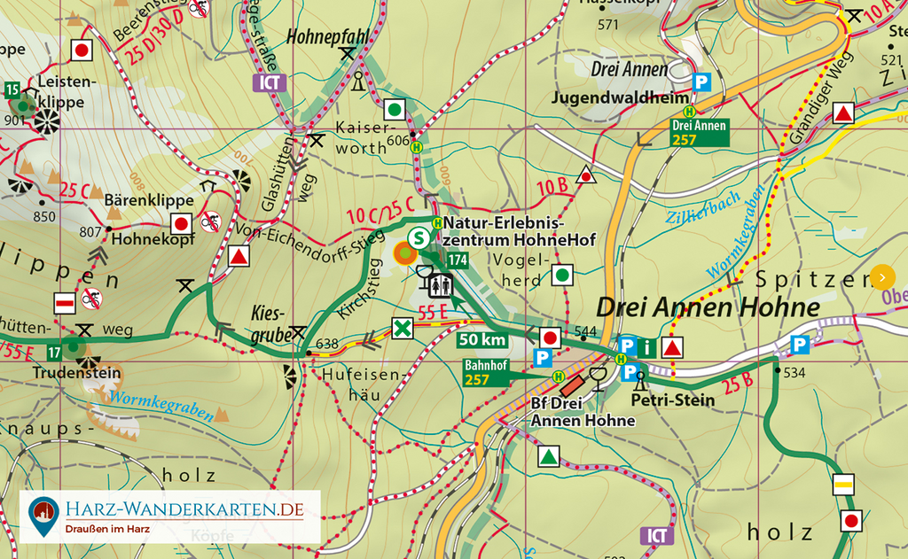 - Der Prädikatswanderweg Harzer Hexen-Stieg ist grafisch deutlich hervorgehoben