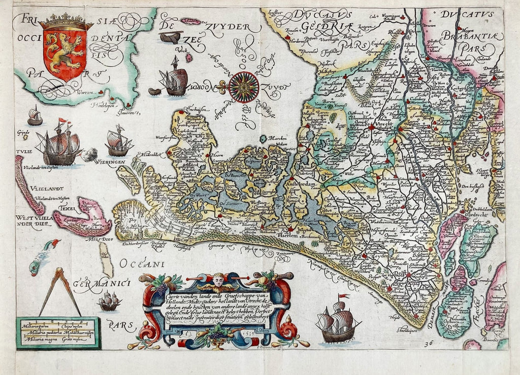 Diese wundervoll gezeichnete Karte der Provinz Holland geht zurück auf niederländischen Künstler Jan Pieterzoon Saenredam (1565–1607). Ursprünglich war das Blatt Teil eines historiographischen Textbuches (Cornelius Aurelius, Die Cronycke van Hollandt, Zeelant ende Vrieslant). Es handelt sich um die dritte Auflage von 1612 (erkennbar ist dies an der Nummierung „36“ sowie am noch vorhandenen Wappen in der linken, oberen Ecke).