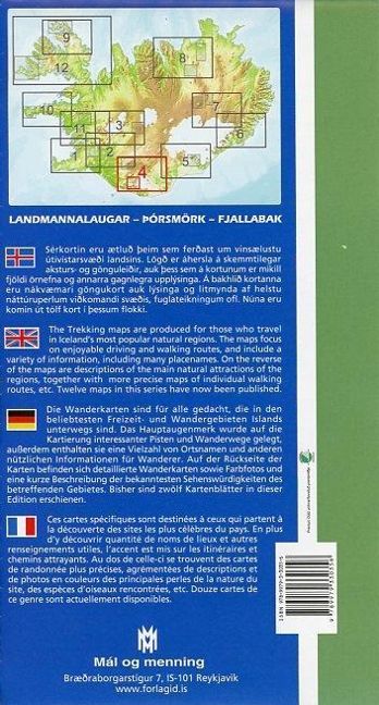 Eine detaillierte Spezialkarte von einem Gebiet, das vor allem Wanderer und Jeepfahrer anlockt. Mit Zufahrten nach Landmannalaugar, Fjallabak-Piste und Strecke nach Lalagigar. Die beliebtesten Trekkingrouten sind ebenfalls enthalten: Laugavegur, Skaelingar und Strutsstigur.