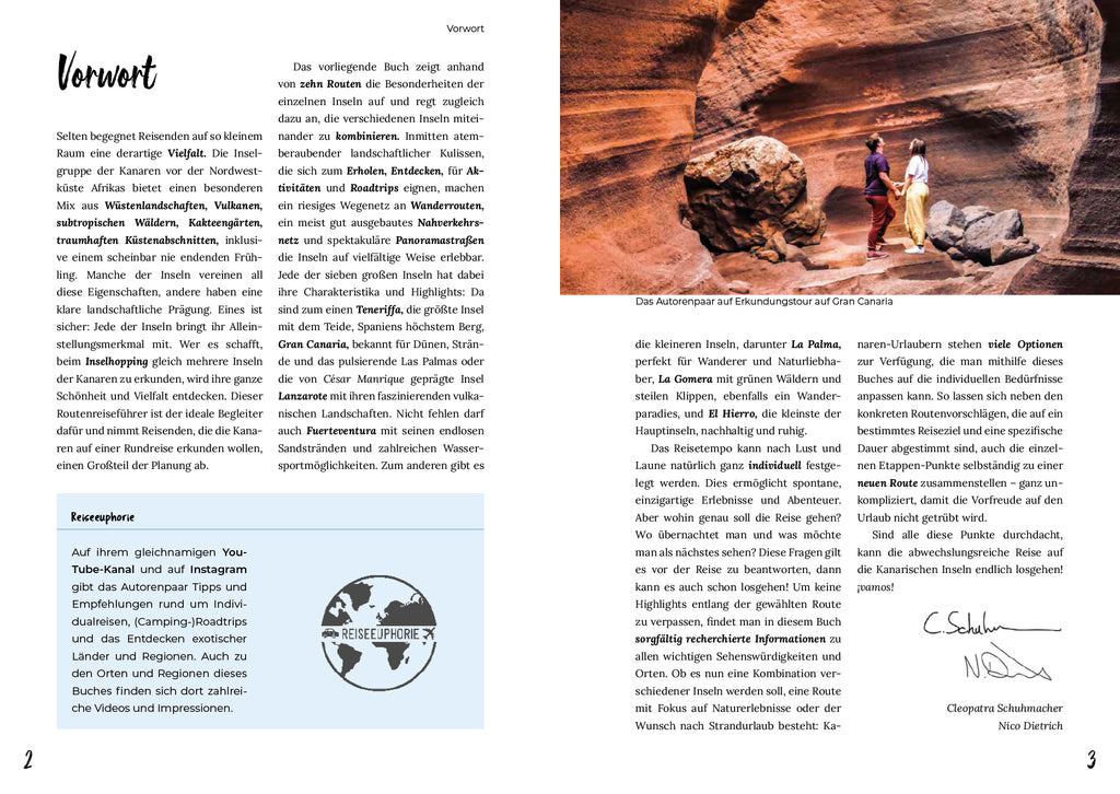 Jede der sieben großen Inseln hat ihre eigenen Besonderheiten und Highlights: Teneriffa, die größte Insel mit dem Teide, Spaniens höchstem Berg. Gran Canaria, bekannt für Dünen, Strände und das pulsierende Las Palmas. Lanzarote mit faszinierenden vulkanischen Landschaften. Fuerteventura mit endlosen Sandstränden und zahlreichen Wassersportmöglichkeiten. La Palma, perfekt für Wanderer und Naturliebhaber. La Gomera mit grünen Wäldern und steilen Klippen, ebenfalls ein Wanderparadies. Und El Hierro, die kleinste der Hauptinseln, nachhaltig und ruhig. Wer es schafft, beim Kanaren-Inselhopping gleich mehrere Inseln zu erkunden, entdeckt ihre ganze Schönheit und Vielfalt. Dieser Routenreiseführer von Bloggerpaar Cleopatra Schuhmacher und Nico Dietrich, den Köpfen hinter "Reiseeuphorie", ist der ideale Begleiter für alle, die die Kanaren auf einer Rundreise erkunden wollen.