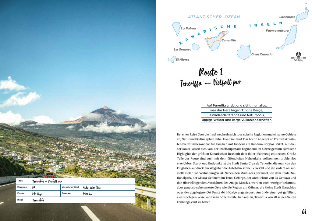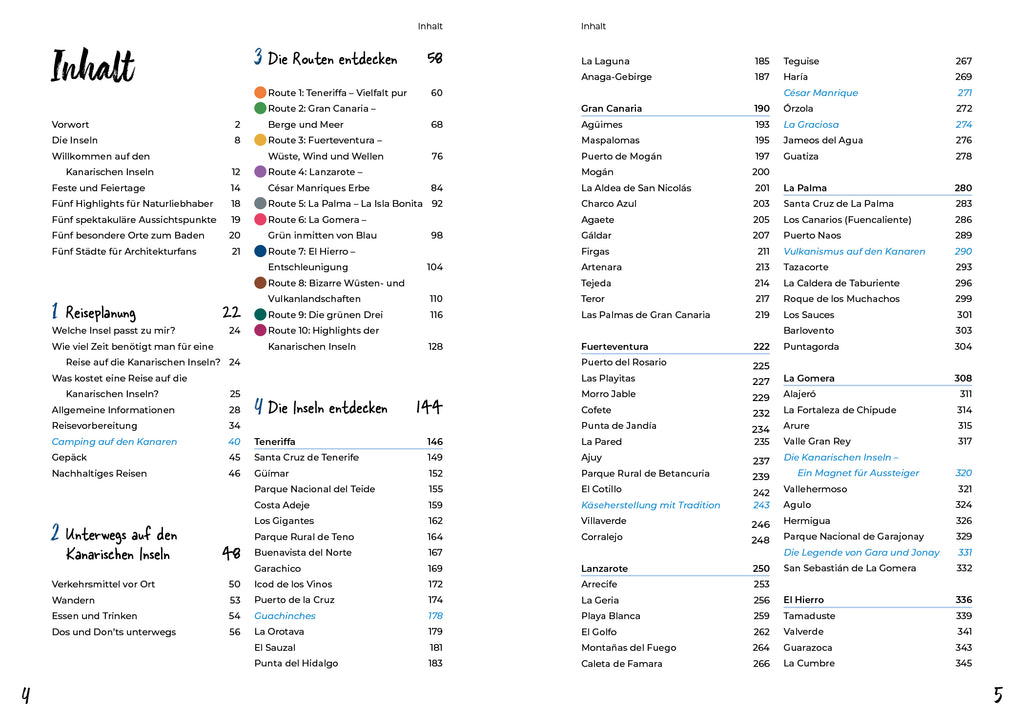 Nur wenige Reiseziele bieten auf kleinem Raum eine solche Vielfalt wie die Kanaren. Die Inselgruppe vor der Küste Afrikas bietet einen besonderen Mix aus Wüstenlandschaften, Vulkanen, subtropischen Wäldern und traumhaften Küstenabschnitten, dazu einen scheinbar nie endenden Frühling. Riesige Wegenetze an Wanderrouten, ein gut ausgebautes Nahverkehrsnetz und spektakuläre Panoramastraßen machen die Inseln auf vielfältige Weise erlebbar. Dieser Reiseroutenführer ermöglicht es, Reiseziele entlang und abseits der Touristenpfade intensiv und individuell zu erkunden.