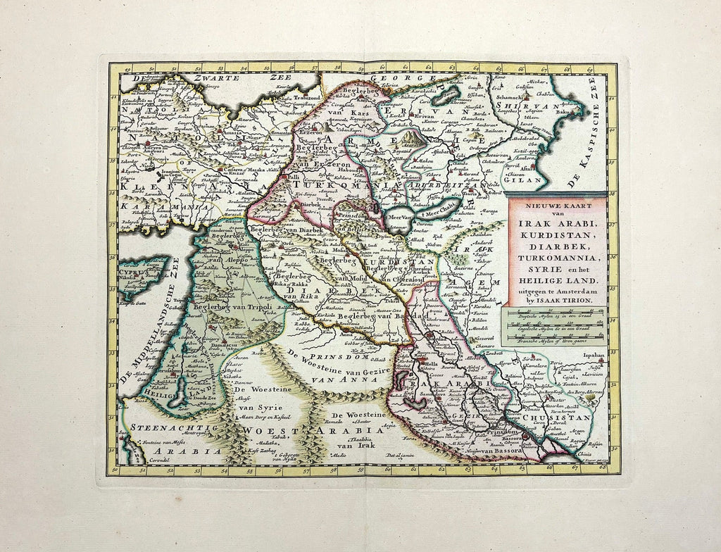 Diese sehr dekorative Karte von Vorderasien geht zurück auf den Amsterdamer Verleger Isaak Tirion (1705–1765). Das Blatt war ursprünglich Teil des Kartenwerks „Nieuwe en beknopte hand-atlas“. Das Buch mit über 100 mittelgroßen Karten zeigte die ganze damals bekannte Welt.