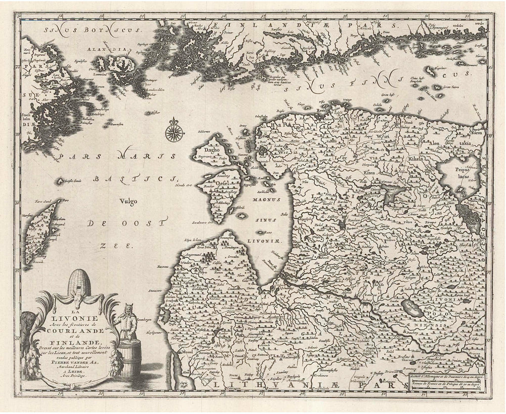Das Kartenbild reicht von Helsinki und Stockholm im Norden bis zur litauischen Stadt Raseiniai im Süden. Von West nach Ost reicht das Kartenbild von Gotland bis zur estnischen Stadt Lawa. Bestimmend für die Komposition sind zahlreichen Flüsse und Seen, die die Landmasse durchbrechen. Bemerkenswert sind die territorialen Grenzen, die durch punktierte Linien angegeben sind. Typisch für die Arbeiten von Pieter van der Aa ist die elegante Linienführung, der dem Kartenbild eine wunderbare Leichtigkeit verleiht. Staunenswert ist auch die kleinteilige Inselwelt vo der skandinavischen Küste, bei der ein fein schraffierter Schattenwurf die eingesetzt wird. Im wunderbar klaren Schwarzweiß kommen diese handwerklichen Feinheiten besonders gut zur Geltung.