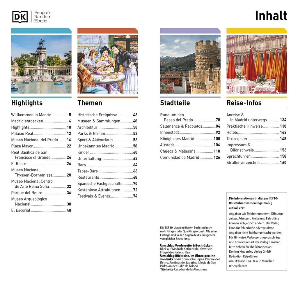 Besuchen Sie eine der eleganten Edelboutiquen in Salamanca, stöbern Sie durch den chaotisch-faszinierenden Flohmarkt El Rastro und lassen Sie im multikulturellen Lavapiés die Nacht zum Tage werden – im TOP10 Madrid-Reiseführer werden die einzelnen Stadtteile und Abstecher ins Umland Madrids übersichtlich und ausführlich porträtiert. Stimmungsvolle Fotos und detaillierte Stadtteil-Karten zeigen berühmte Sehenswürdigkeiten, charmante Stadtviertel sowie Restaurant-, Shopping- oder Tourenvorschläge auf einen Blick.
