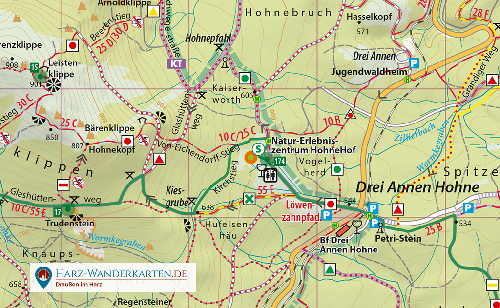 - Trailpark Harz. Die vier zum Zeitpunkt der Drucklegung bereits eröffneten Strecken sind in der Karte verzeichnet.
