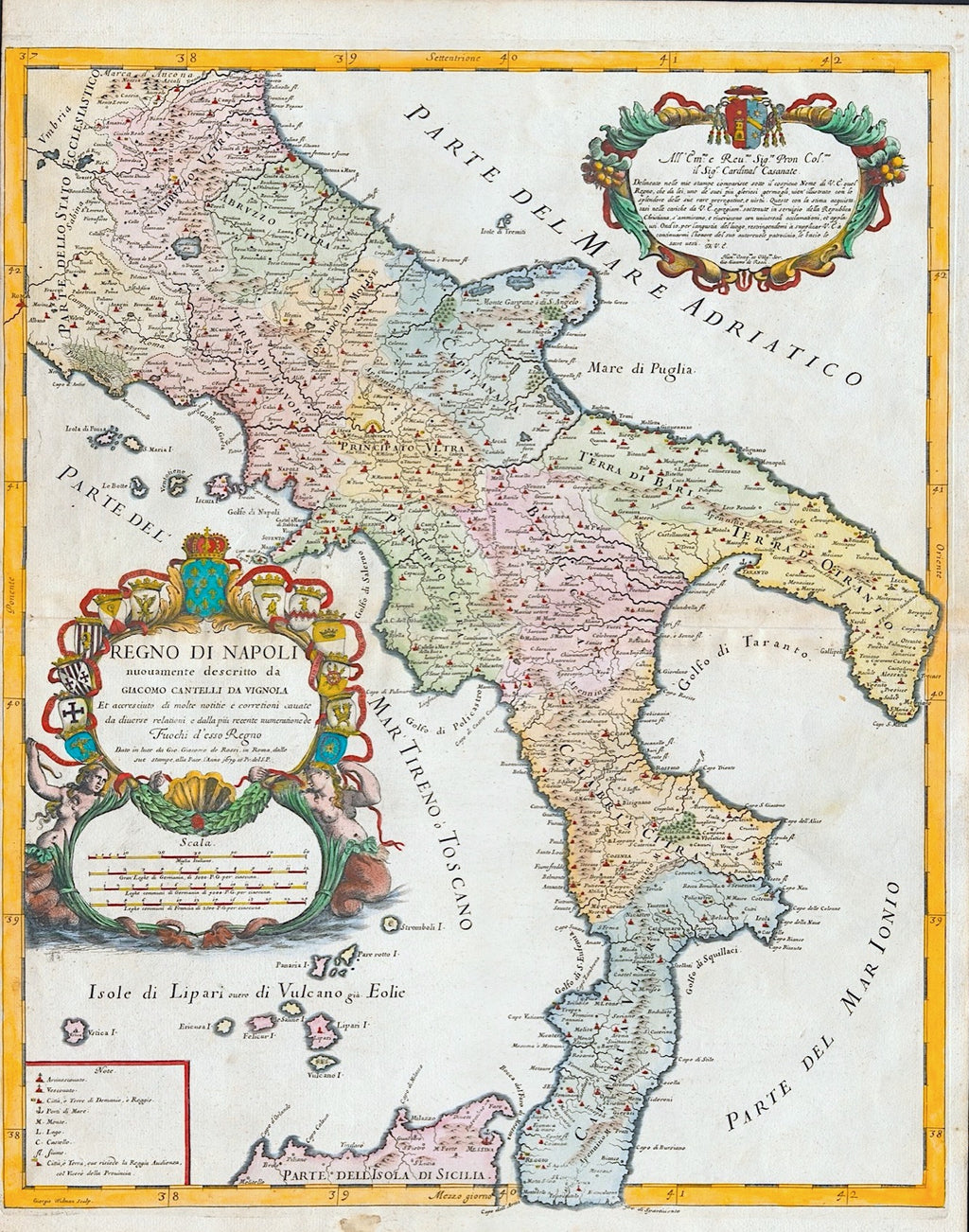 Diese detailreiche Karte des Königreichs Neapel geht zurück auf den italienischen Kartografen Giacomo Cantelli da Vignola (1643–1695). Das Blatt war ursprünglich Teil des Kartenwerks „Mercurio geografico overo Guida geografica in tutte le parti del mondo“, einem monumentalen Weltatlas mit 150 Darstellungen, der von Giovanni Giacomo de Rossi (1627–1691) verlegt wurde.