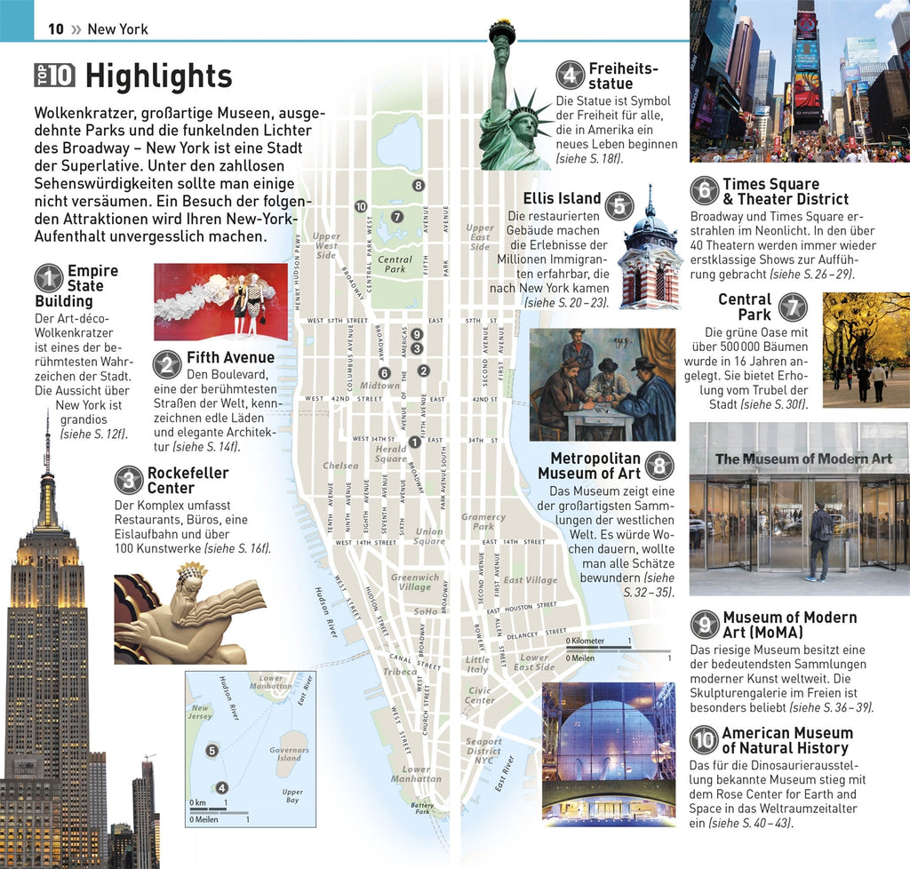 Schlendern Sie durch die elegante Upper East Side, genießen Sie das maritime Flair des alten Hafenzentrums South Street Seaport oder bestaunen Sie mit einem Cocktail in der Hand die nächtliche Skyline von Manhattan – im TOP10 New York Reiseführer werden die einzelnen Stadtteile von New York übersichtlich und ausführlich porträtiert. Stimmungsvolle Fotos und detaillierte Stadtteil-Karten zeigen weltberühmte Sehenswürdigkeiten, charmante Stadtviertel sowie Restaurant-, Shopping- oder Tourenvorschläge auf einen Blick.