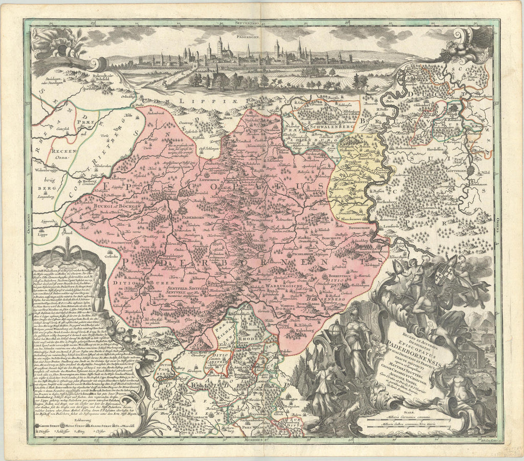 Diese sehr seltene Karte des Bistums Paderborn geht zurück auf den bekannten Augsburger Verleger Matthäus Seutter (1678–1757). Das Blatt war ursprünglich Teil eines Atlasses und könnte vom Verlag Homann Erben gedruckt worden sein.