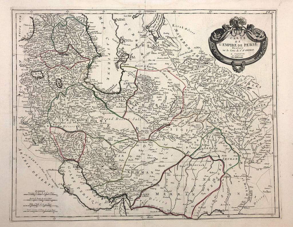 Diese sehr elegant gezeichnete Karte des Persischen Preiches geht zurück auf den venezianischen Verleger Paolo Santini (1729–1793). Der eigentliche Autor des Kartenbildes war Jean-Baptiste Bourguignon d`Anville (1697–1782). Ursprünglich war das Blatt Teil des „Atlas Universel dresse sur des Meillieures Cartes Modernes“.