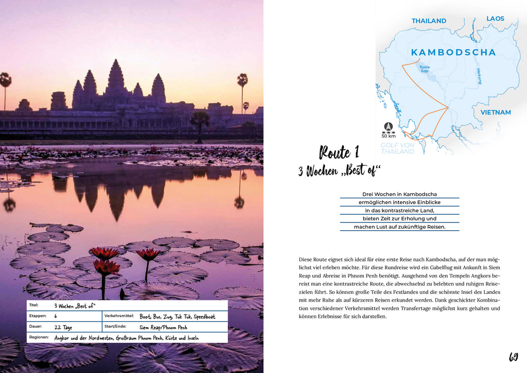 Geheimnisvolle Tempelruinen, strahlend weiße Strände und herzensgute Menschen machen das Königreich Kambodscha zu einem kontrastreichen Reiseziel, das deutlich mehr zu bieten hat, als viele erwarten. Beim bewegenden Anblick Angkor Wats, während der Erkundung der Mahnmale der Schreckensherrschaft der Roten Khmer, auf den traumhaft schönen Inseln und in der Metropole Phnom Penh wird immer mehr Reisenden klar, dass Kambodscha zu Unrecht im Schatten seiner großen Nachbarn Thailand und Vietnam steht. Trotz weiterhin vielerorts sichtbarer Armut ist dem kleinen Land der Aufbruch in die Zukunft längst gelungen. Dieser Reiseroutenführer ermöglicht es, Reiseziele entlang und abseits der Touristenpfade intensiv und individuell zu erkunden.