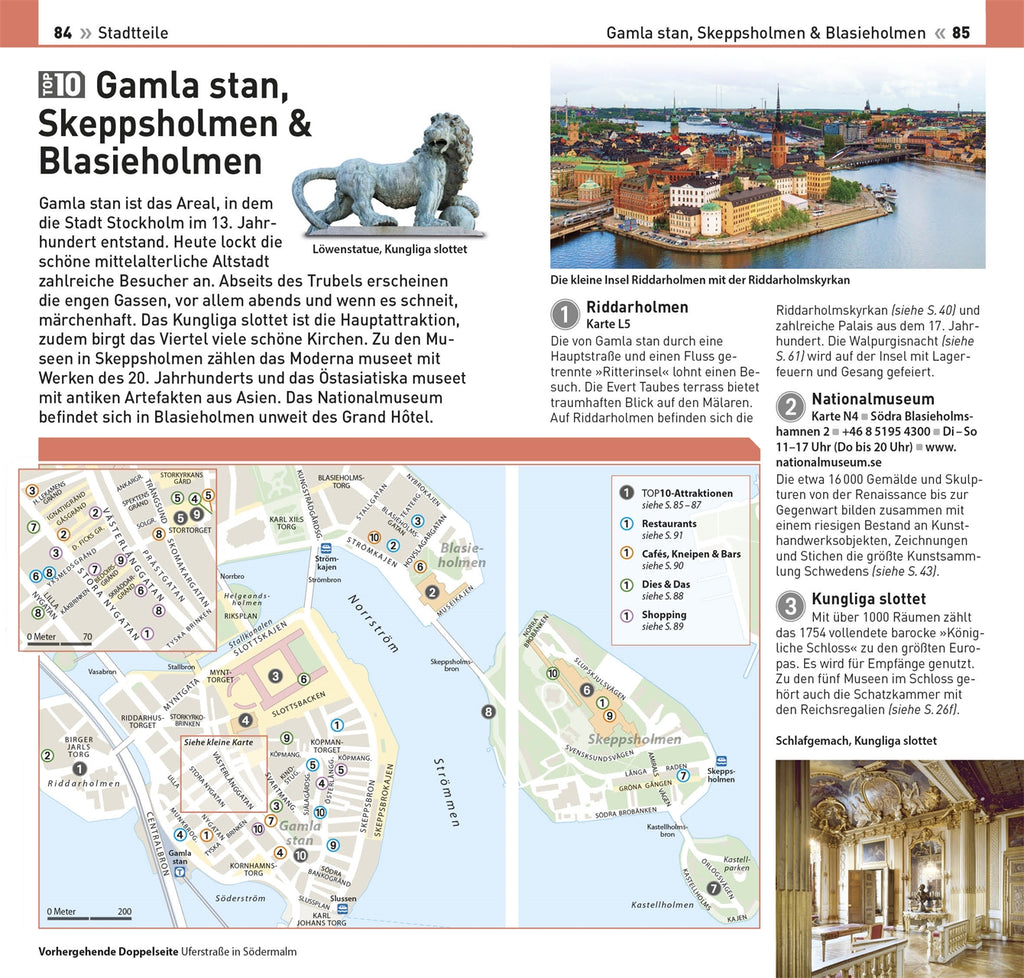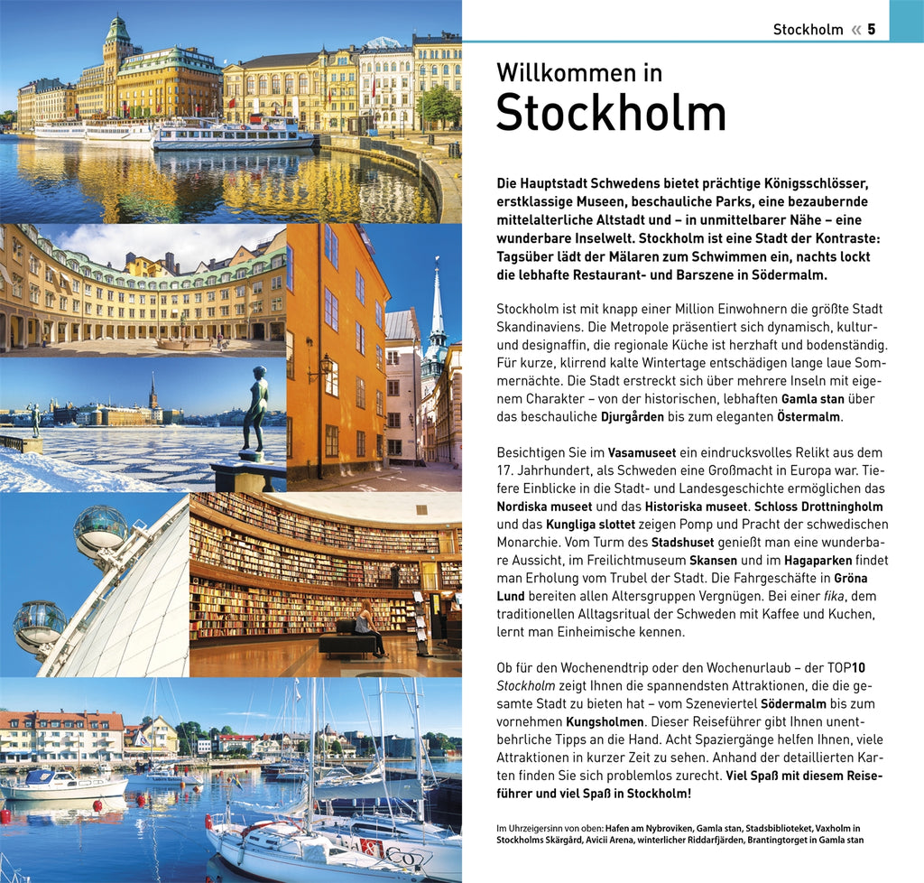Norrmalm & City, Kungsholmen & Vasastan, Gamla stan, Skeppsholmen & Blasieholmen – im TOP10 Stockholm-Reiseführer werden die einzelnen Stadtteile und das Umland Stockholms übersichtlich und ausführlich porträtiert. Stimmungsvolle Fotos und detaillierte Stadtteil-Karten zeigen berühmte Sehenswürdigkeiten, charmante Stadtviertel sowie Restaurant-, Shopping- oder Tourenvorschläge auf einen Blick.