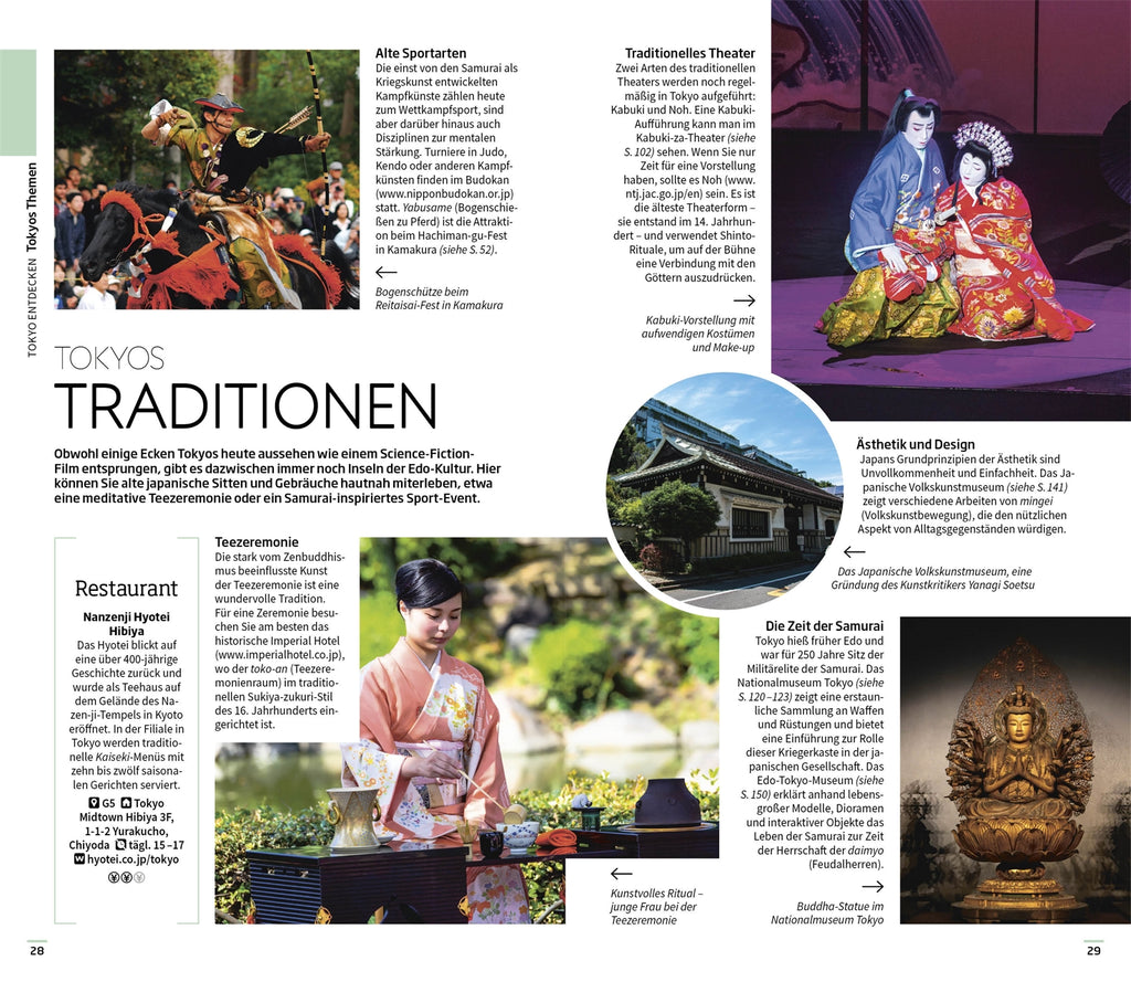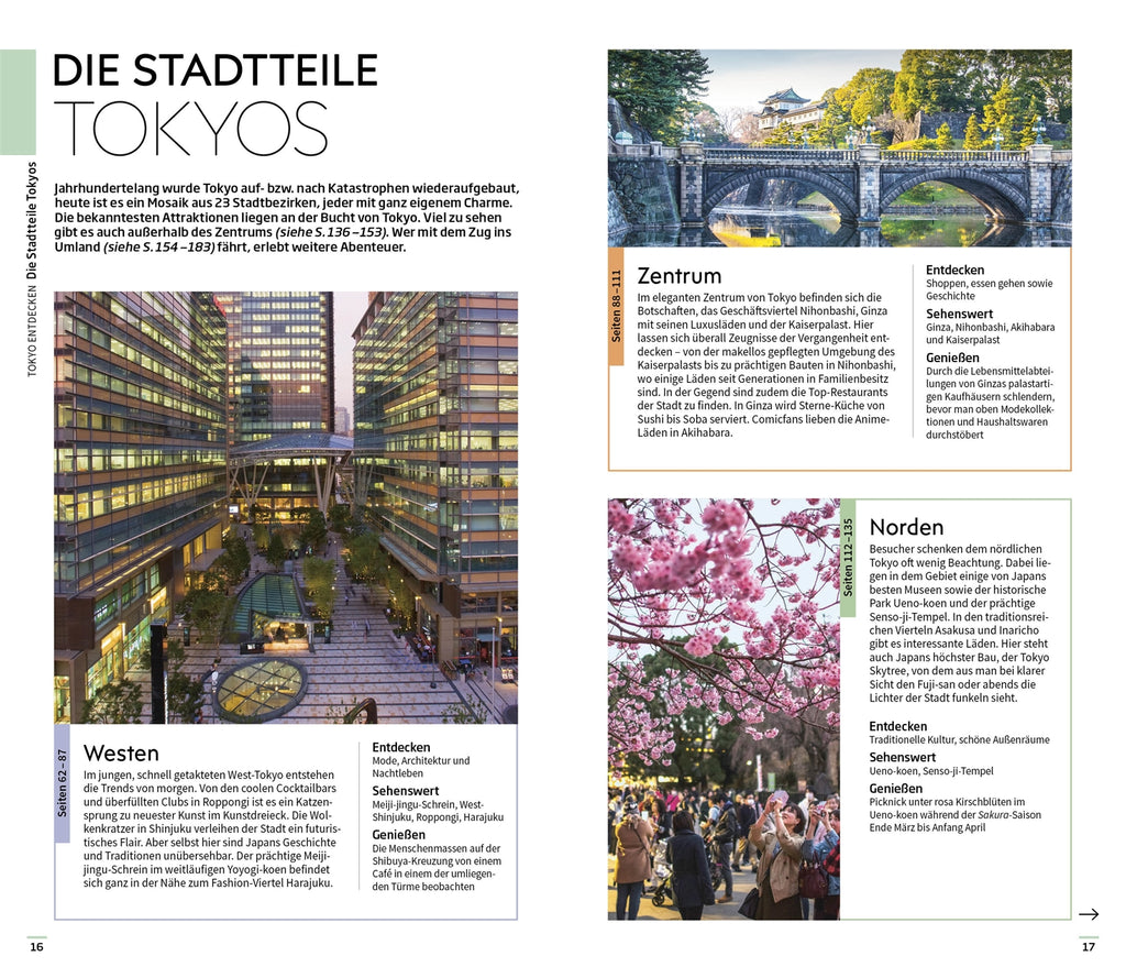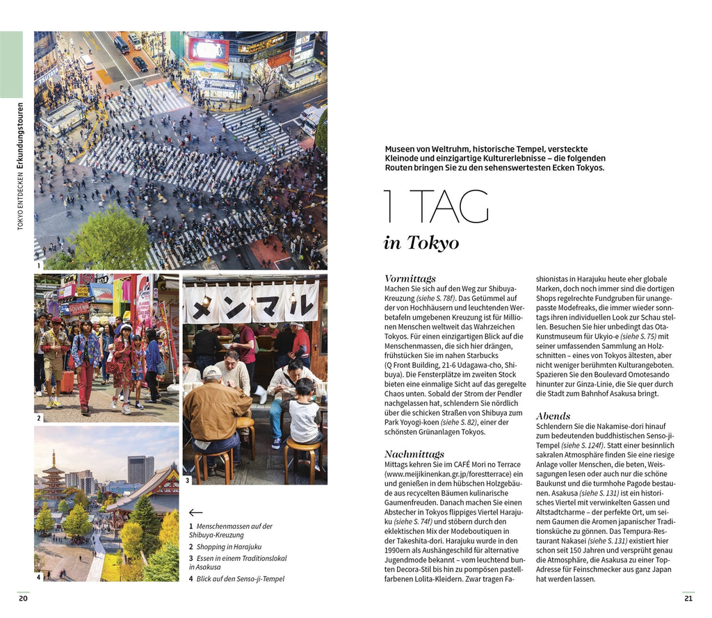 der ji-Tempel, der älteste und zugleich heiligste Tempel Tokyos, und der ehrwürdige Gu Schrein. Mit den handgezeichneten Spaziergängen entdecken Sie die schönsten Orte verschiedener Stadtteile auf ganz besondere Art und Weise. Bildgewaltige Themenseiten rücken charakteristische Besonderheiten – wie die alten Traditionen aus der Edo-Ära, Tokyos vielfältige Essenskultur oder die wunderschönen Gärten und Parkanlagen – in den Fokus.