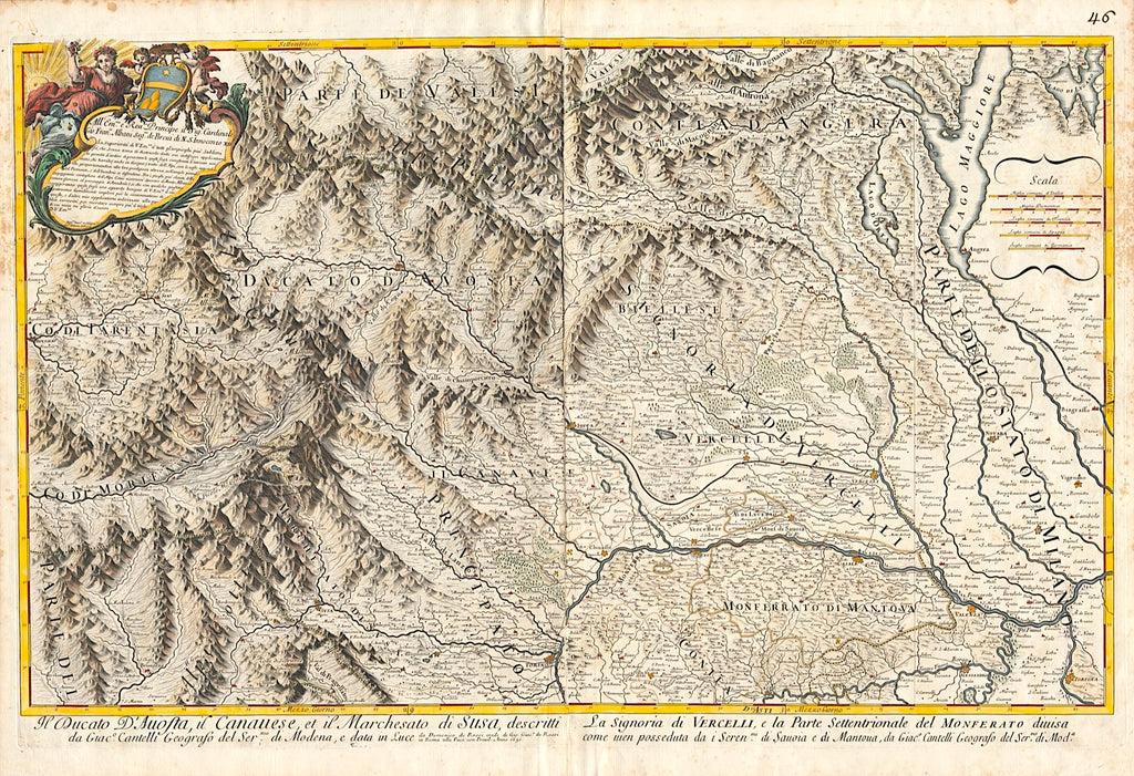 Diese detailreiche Karte des südlichen Piemont und der französischen Alpen geht zurück auf den italienischen Kartografen Giacomo Cantelli da Vignola (1643–1695). Das Blatt war ursprünglich Teil des Kartenwerks „Mercurio geografico overo Guida geografica in tutte le parti del mondo“, einem monumentalen Weltatlas mit 150 Darstellungen, der von Giovanni Giacomo de Rossi (1627–1691) verlegt wurde.