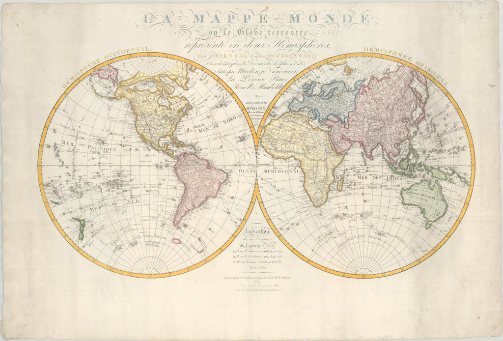 La Mappe-Monde ou le Globe Terrestre Represente en Deux Hemispheres, l'un Oriental l'Autre Occidental , ou sont marquees Les Decouvertes les plus recentes Faites par Mackenzie, Vancouver, La Perouse, Bruce, Renell, Humboldt